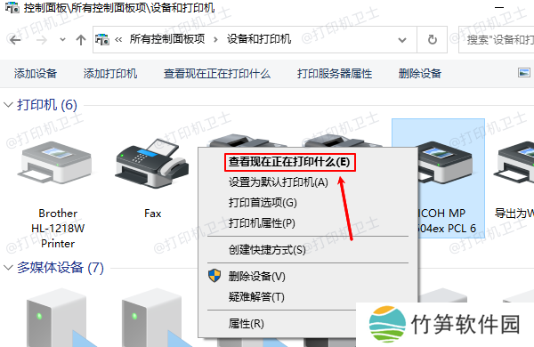 打开“控制面板”->“设备和打印机”。右键点击你使用的打印机,选择“查看现在正在打印什么”。