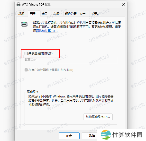 在“共享”选项卡中,取消“共享这台打印机”的勾选。