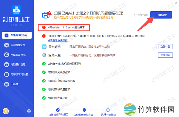 2、如果检测到打印机驱动异常,点击右上方的“一键修复”按钮,软件会自动下载并安装最新的驱动程序。