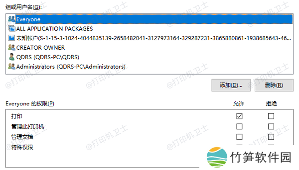 2、在主电脑上,右键点击共享打印机,选择 “打印机属性”,在 “安全” 标签页下,点击 “权限” 按钮,确保相关用户和组有足够的权限访问共享打印机。