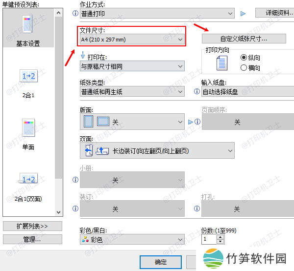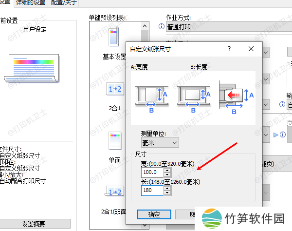 4、打开驱动程序,找到“文件尺寸”或“自定义纸张尺寸”选项。输入具体纸张尺寸(宽度×高度),保存并应用更改。