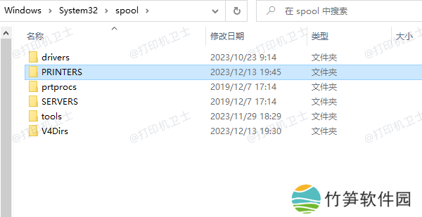 3、打开 C:WindowsSystem32spoolPRINTERS 目录,删除其中的所有文件。