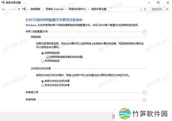 3、在“专用”和“公用”网络设置下,找到“文件和打印机共享”,选择“启用文件和打印机共享”。