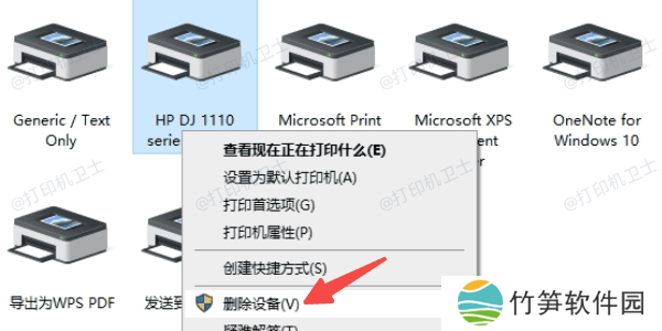 在控制面板中,右键点击打印机,选择“删除设备”。