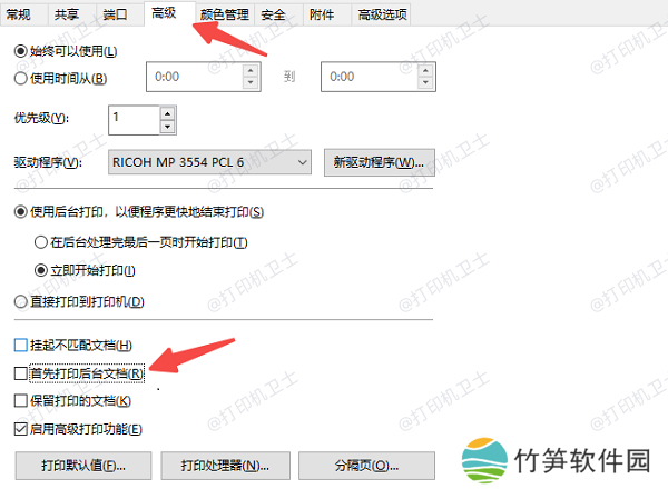 3、进入“高级”选项卡,取消勾选“首先打印后台文档”,然后点击确定。
