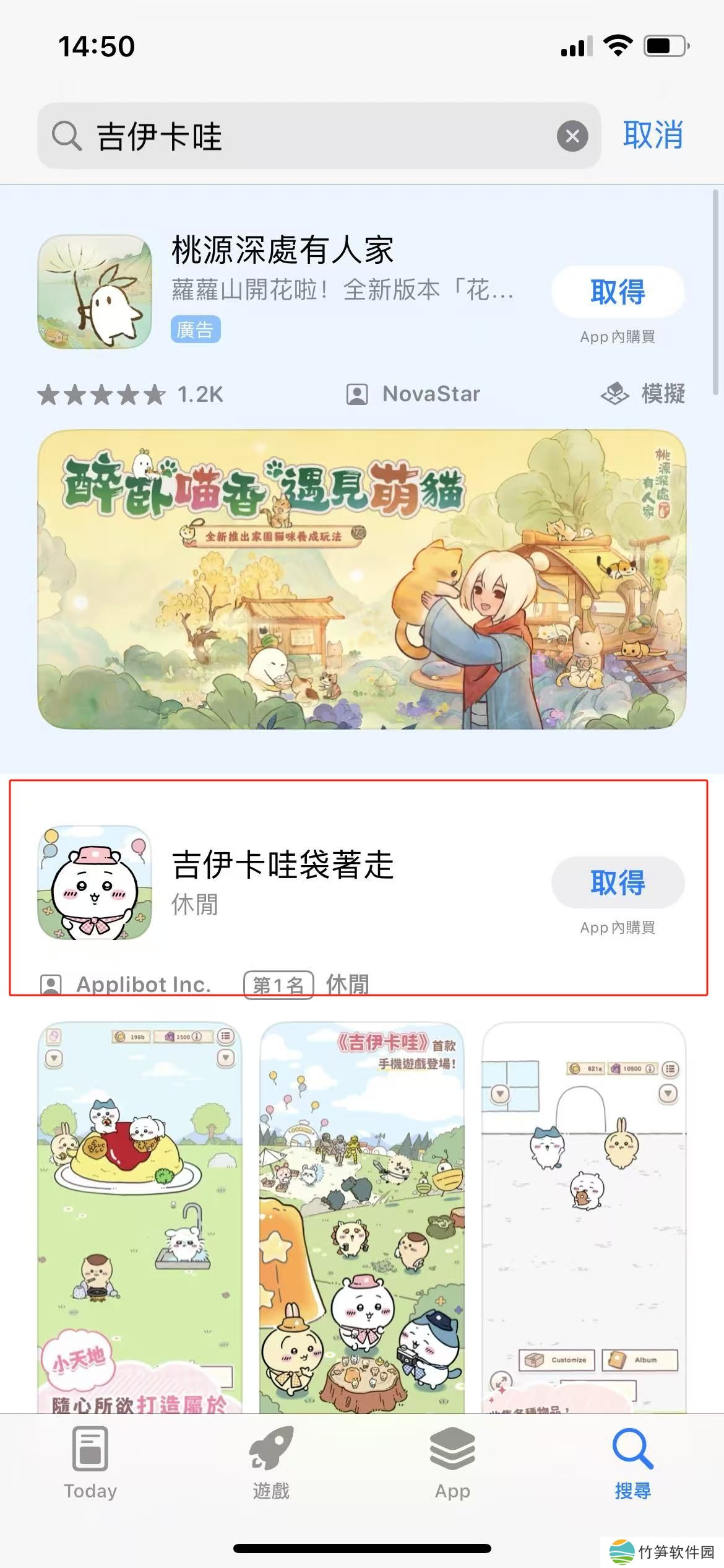 2、顺利登录之后搜索“吉伊卡哇”,下图显示的“吉伊卡哇袋著走”是Chiikawa Pocket直译而来,并非错误,点击取得就可下载游戏到手机。