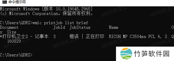 在CMD窗口输入以下命令,并按回车:wmic printjob list brief这将显示当前所有打印任务,包括作业ID、状态和打印机名称。