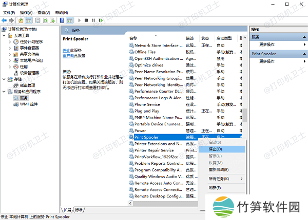 2、在服务列表中找到 Print Spooler(打印后台处理程序),右键点击它,选择停止。