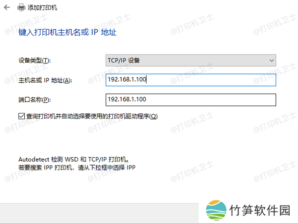 在 主机名或 IP 地址 处输入 192.168.1.100,系统将尝试检测并安装打印机。