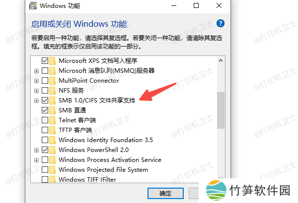 2、在弹出的 “Windows 功能” 窗口中,找到 “SMB 1.0/CIFS 文件共享支持”,勾选该选项。