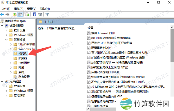 2、依次展开 “计算机配置” > “管理模板” > “打印机”。