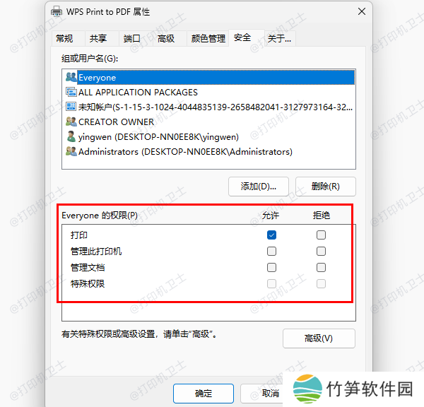 在打印机属性的 安全 选项卡中,检查用户组(如Everyone、Guest)是否拥有打印权限。
