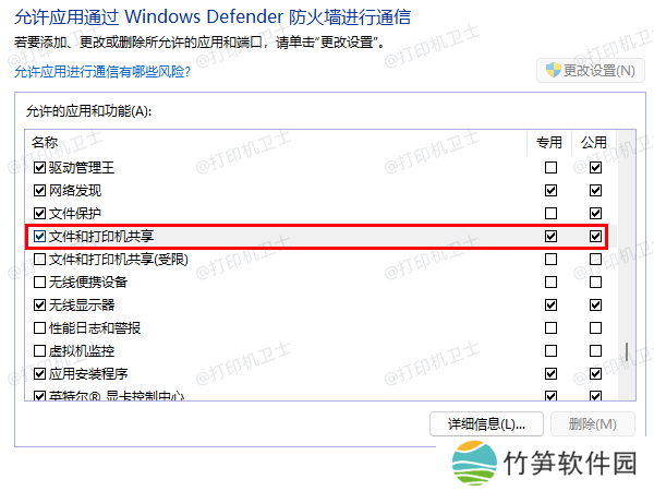 确保 文件和打印机共享 选项在“专用”和“公用”网络均被勾选。