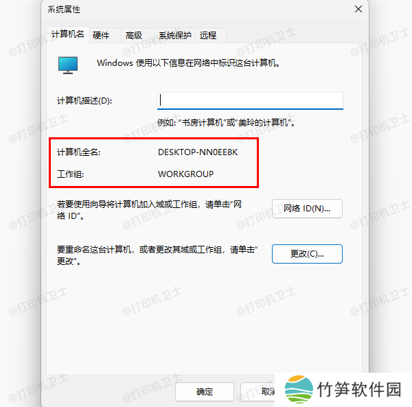 所有共享设备需处于同一工作组(默认一般为WORKGROUP),若不一致需点击“更改”统一修改。
