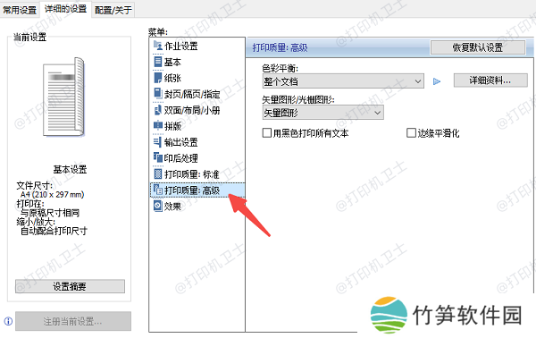 2、在“打印质量”选项中,将质量调至“高级”或“最佳模式”。