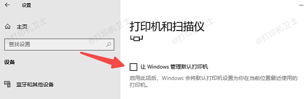 2、在右侧找到“让 Windows 管理默认打印机”,如果该选项已开启,点击关闭。否则系统会自动更改默认打印机。