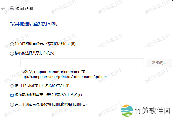 若未自动搜索到,点击【我需要的打印机不在列表中】旁边的【手动添加新设备】,输入共享打印机的完整路径(格式:\主机电脑名打印机共享名)。
