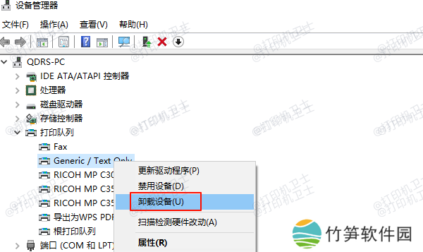 右击开始菜单 → 选择 “设备管理器” → 展开 “打印队列” → 右击故障打印机 → “卸载设备”,勾选 “删除驱动程序软件”。