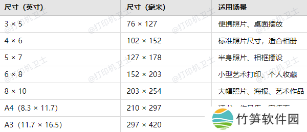 尺寸(英寸) 尺寸(毫米) 适用场景3×5 76×127 便携照片、桌面摆放4×6 102×152 标准照片尺寸,适合相册5×7 127×178 半身照片、相框摆设6×8 152×203 小型艺术打印、个人收藏8×10 203×254 大幅照片、海报、艺术作品A4(8.3×11.7) 210×297 证书、作品集、宣传页A3(11.7×16.5) 297×420 大型展示、商业宣传