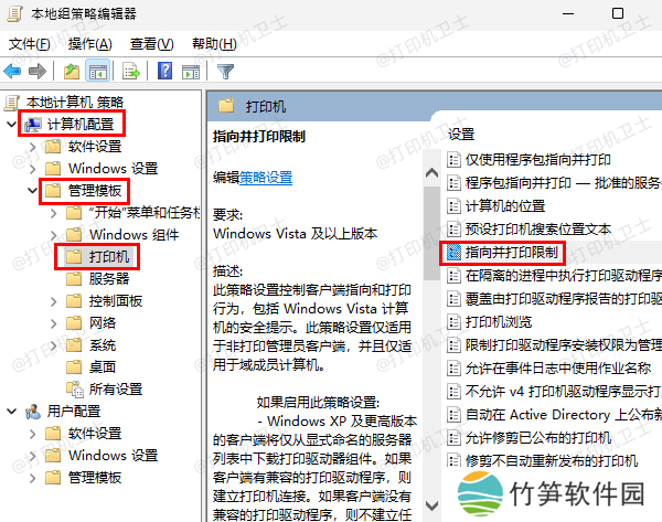 找到 “指向并打印限制”,双击打开,选择“已启用”。