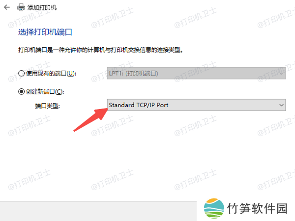 选择“添加本地打印机”>“创建新端口”>“Standard TCP/IP Port”。