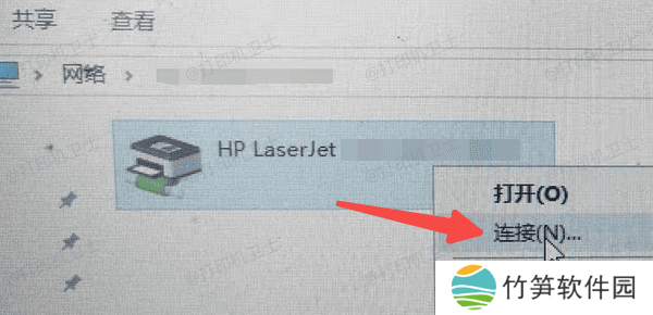 3、如果看到共享打印机,右键点击打印机,选择“连接”。