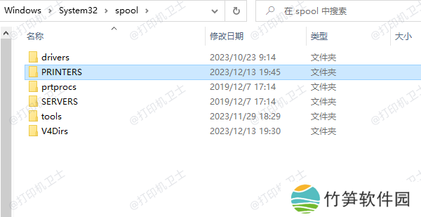 4、按下 Win + R,输入 spool 并回车,进入 C:WindowsSystem32spoolPRINTERS 目录。