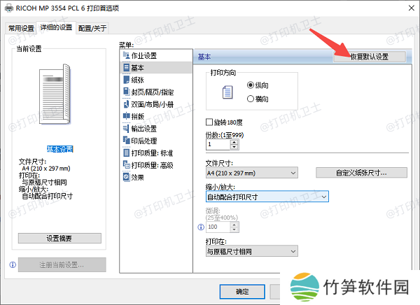 2、选择“打印首选项”,在“详细的设置”选项卡中点击“恢复默认设置”。