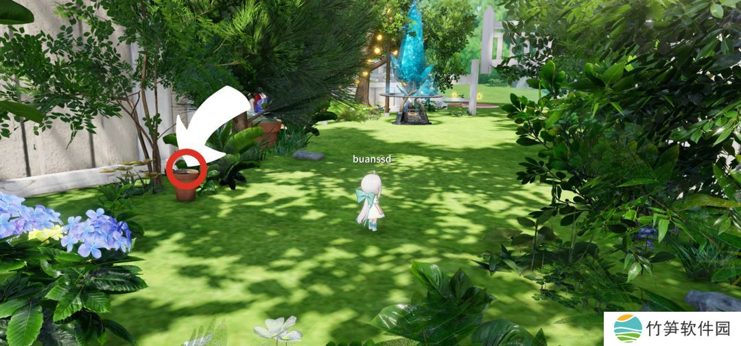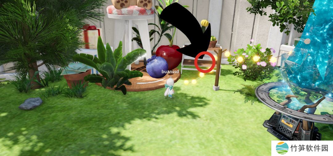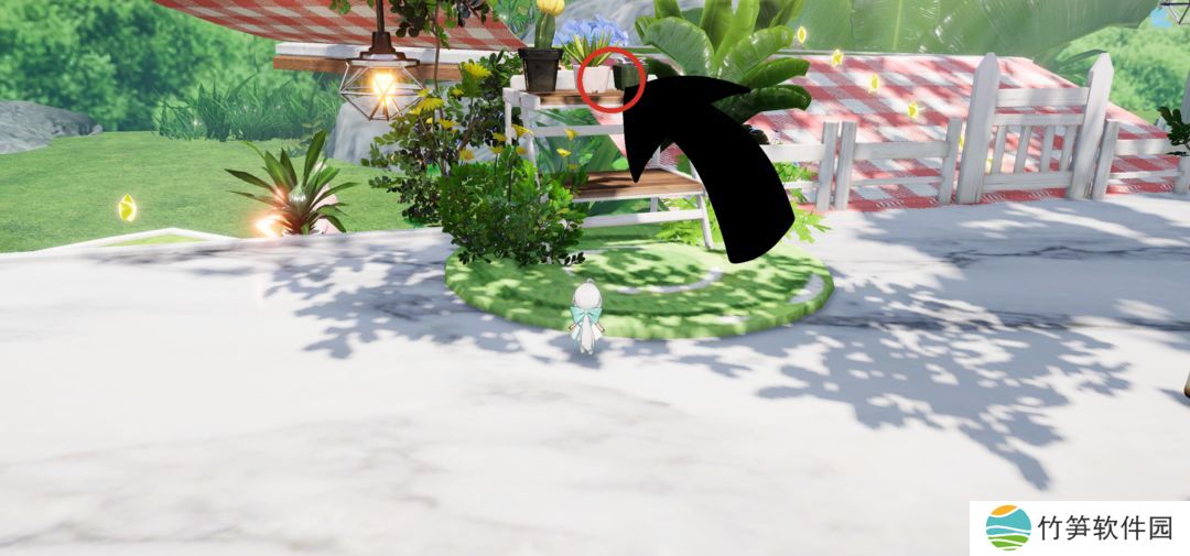 进入地图后,激活区域装置,走出白色栅栏门后跟着星星走,一直到有着灰物的平台上,将灰物击败后走到距离探索员最近的架子前,跳上摆着三株植物的顶层就能看到了
