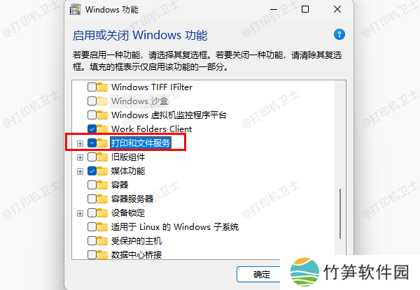 在“控制面板”>“程序”>“程序和功能”>“启用或关闭Windows功能”中,勾选“打印和文档服务”。