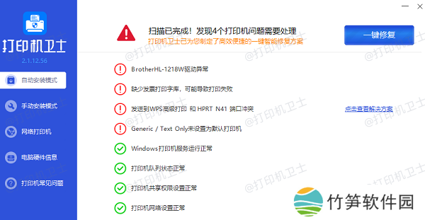 ③、根据检测结果点击“一键修复”软件便会进行下载安装驱动,同时解决修复打印机问题。