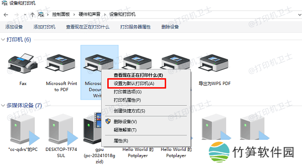 2. 查看打印机是否显示为“脱机”或“不可用”,右键点击选择“设置为默认打印机”;