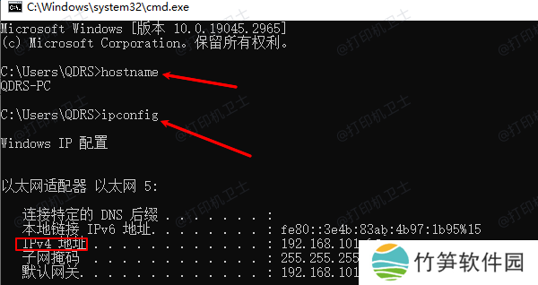 3、输入命令ipconfig,查找本地IPv4地址,即主机的局域网IP。