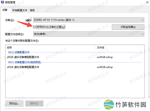 2、选择“设备”栏中你的惠普打印机,勾选“使用我对此设备的设置”。