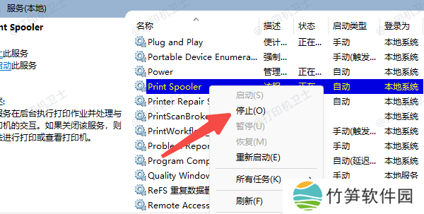 在服务列表中找到 Print Spooler,右键选择 停止。