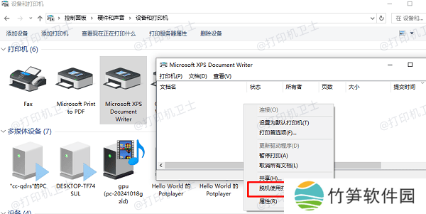 打印机是否处于“脱机”状态?在“控制面板”的“设备和打印机”中,双击打印机图标,确认是否勾选了“使用脱机打印”,如有,请取消。