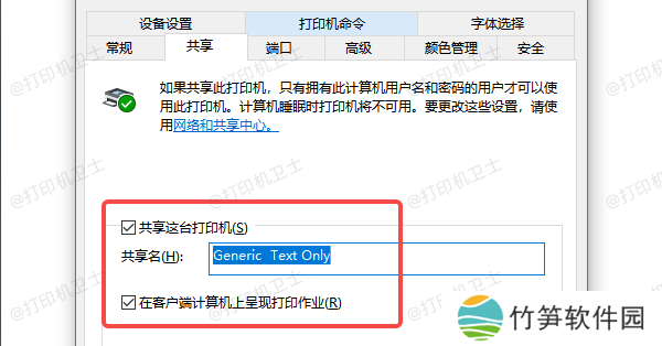 在“共享”选项卡下,勾选“共享这台打印机”,并为打印机设定一个简洁的共享名称(如Printer01);
