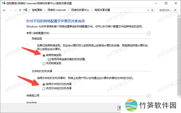 2、确保“网络发现”和“文件和打印机共享”都已启用,保存设置后重启电脑。