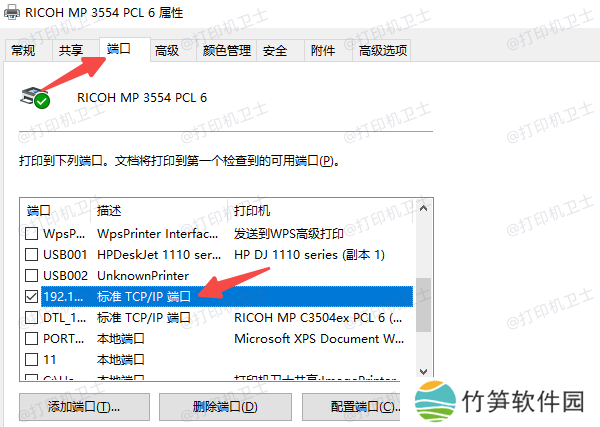 3、切换到“端口”标签页,可以看到打印机当前所使用的端口名称与类型(如:Standard TCP/IP Port - 192.168.1.100)。