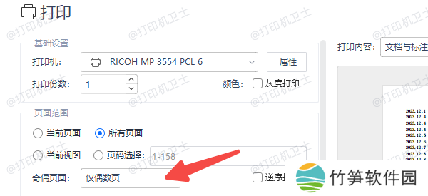 1、在打印设置中选择“仅打印奇数页”,点击“打印”。