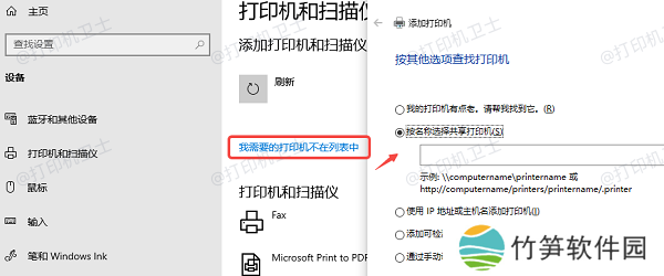 4. 在弹出的窗口中,选择“通过共享名称选择打印机”,输入共享路径,例如:`\主机电脑名称共享打印机名称`,然后点击下一步。
