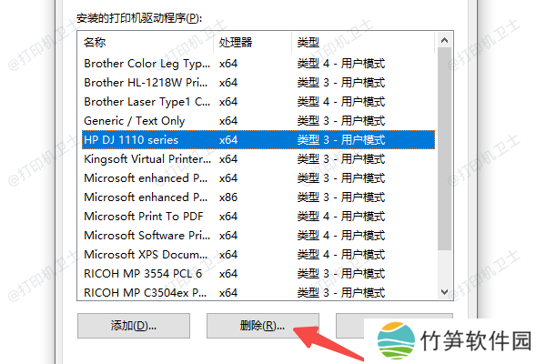 3、在“驱动程序”标签页中,找到对应打印机驱动,点击“删除”。
