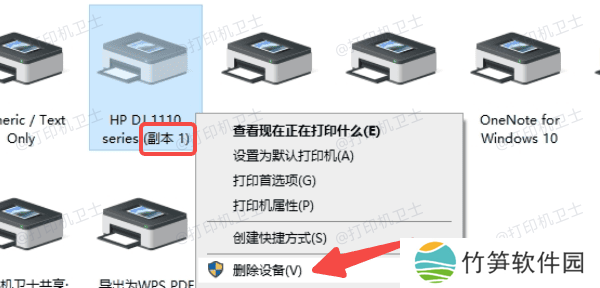 3、右键点击需要删除的打印机副本,选择“删除设备”。