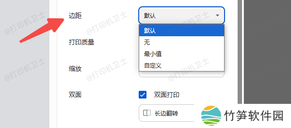 3、在“边距”一栏中选择“默认”、“无”、“最小”或“自定义”。