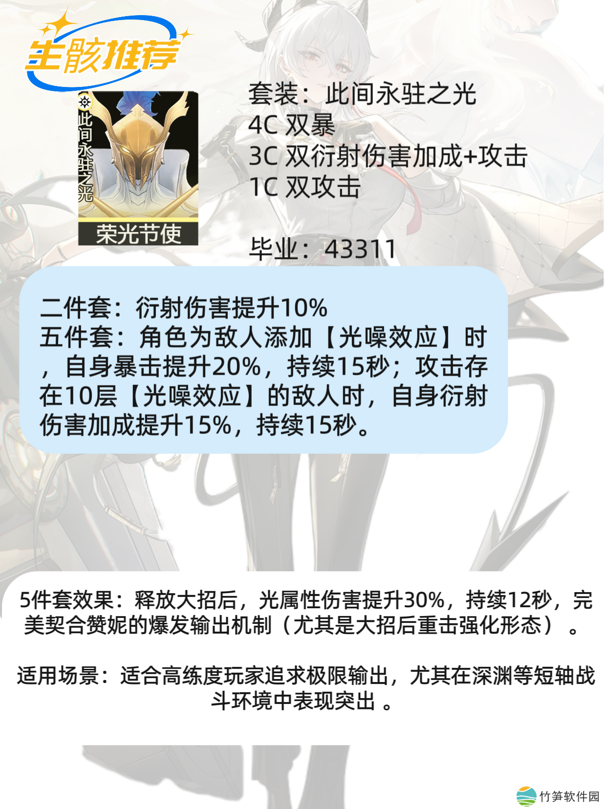 5件套效果:释放大招后,光属性伤害提升30%,持续12秒,完美契合赞妮的爆发输出机制(尤其是大招后重击强化形态)。