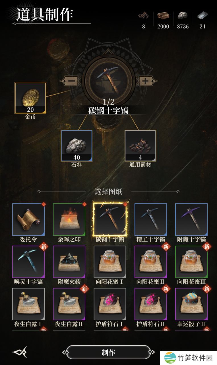 升级铁匠铺会获得图纸,就可以制作镐子啦。制作镐子所需的通用素材可以在主线和商店中获得哦!