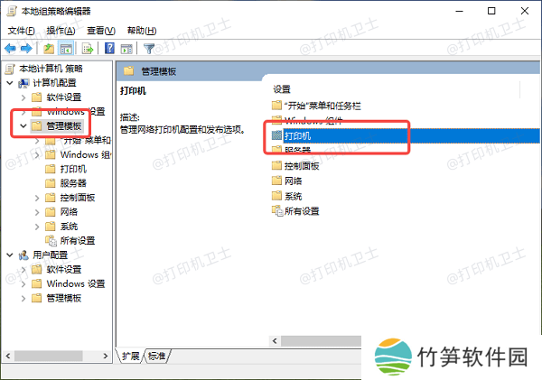 2. 路径:计算机配置 > 管理模板 > 打印机。