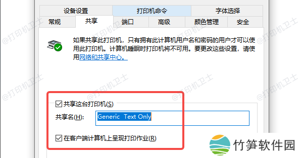 3. 在“共享”选项卡中,勾选“共享此打印机”,并设定一个简洁的共享名称。