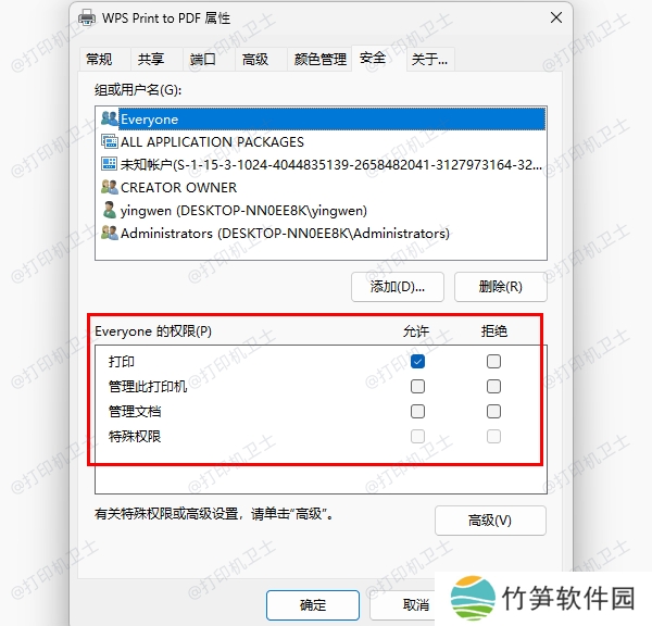 2、安全权限同步在打印机属性的【安全】选项卡中,确保用户组(如Everyone、Users)至少拥有“打印”权限。
