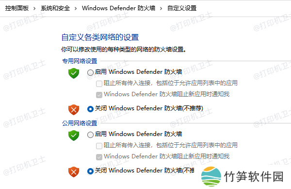 暂时关闭Windows Defender防火墙(进入【控制面板】>【系统和安全】>【Windows Defender 防火墙】>【启用或关闭Windows Defender 防火墙】)。
